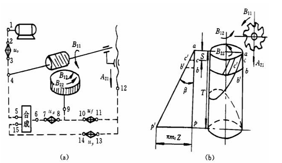 凌机圆柱斜齿轮表示从传动原理图a) 可以看出,滚切斜齿齿轮时必须有四条传动链: